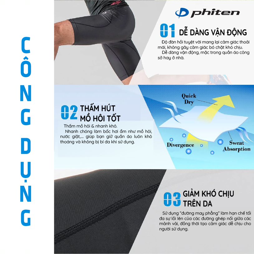 – Công nghệ Phiten giúp lưu thông máu, cải thiện tình trạng căng cơ, đau cơ khi tập luyện.